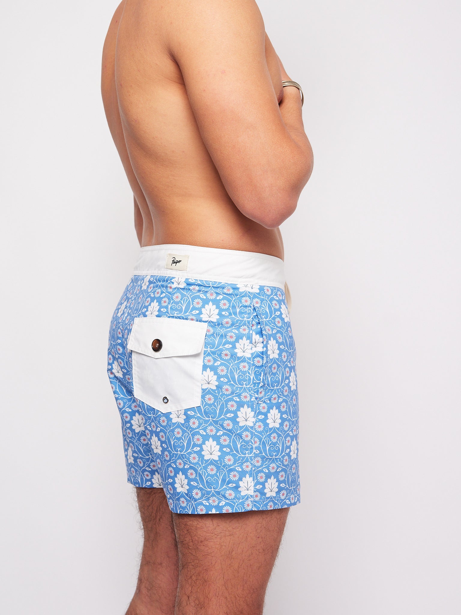 Maillot de bain pour homme avec une taille fixe style surf et un cordon de serrage. La longueur du vêtement est courte pour évoquer les maillots de bain de surf des années 70. Tissu 100% polyester pour faciliter le séchage et son aspect mat. Il a deux poches latérales sans fermeture et une à l'arrière avec un bouton.